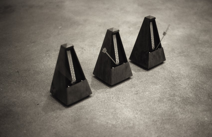 Work No. 223 Three metronomes beating time, one quickly, one slowly, and one neither quickly or slowly 1999 Mechanical metronomes 3 parts, each 4.5 in / 11.5 cm high; overall dimensions variable