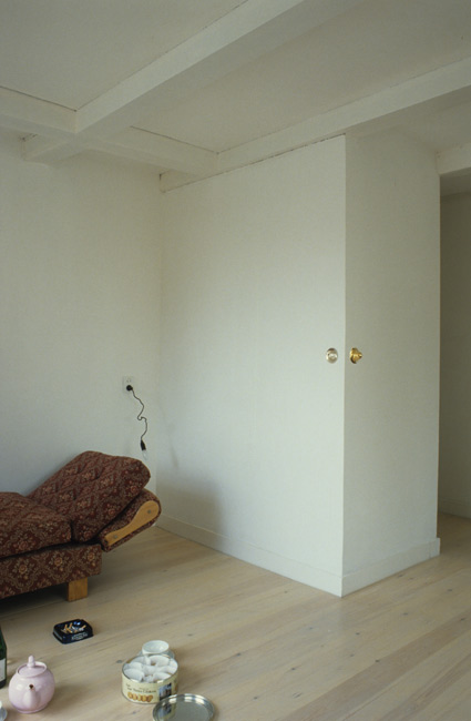 Work No. 99 An intrusion and a protrusion from a wall 1994 Silver-plated bass in / gold plated brass out; external corner 2 parts, each 3 in / 7.6 cm diameter
