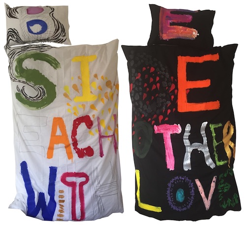Work No. 3346 B E SI DE EACH OTHER WITH LOVE 2019 Acrylic, marker pen and pencil on cotton 4 parts: 2 parts each 75 x 50 cm and 2 parts each 150 x 200 cm